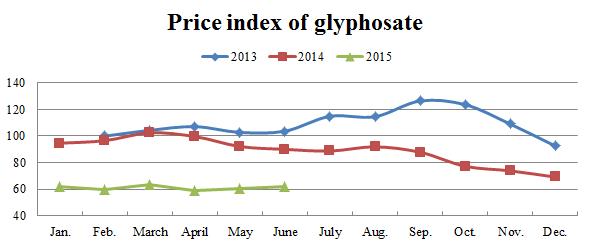 The transaction prices of the technical of pesticides in the first half of the year fluctuated within a relatively low price range, of which that of the herbicide glyphosate saw the biggest fluctuations. Due to the price hikes earlier in the market and the less-than-expected supply and demand, glyphosate was “depressed” after sharp rises and falls. Many manufacturers already manufacture at a price close to cost price and even lower. The average weighted transaction price of glyphosate in the first half of the year was RMB19,600 per ton, down 51.72% from the highest price (RMB40,600 per ton) in 2013 and down 36.36%from the average price in the first half of last year, which had pulled down the price index of herbicides to a great extent. Figure 2 Price index of glyphosate