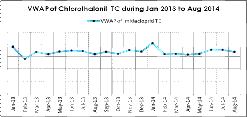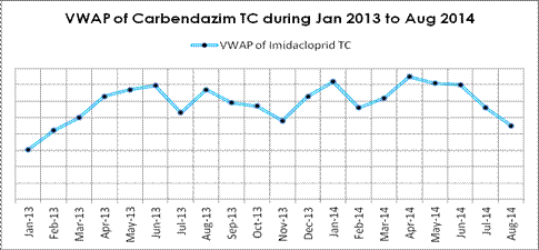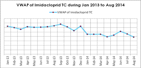 According to CCPIA Monthly Bulletin of Statistics of China Pesticides, in Aug, VWAP of imidacloprid TC declined by $1180 per tonne than that of Jul. Actually seen from the recent one year’s tendency, price of imidacloprid has been generally going down, especially in 2014. Most manufacturers’ transaction price didn’t change in Aug, while some declined over 8% MoM.