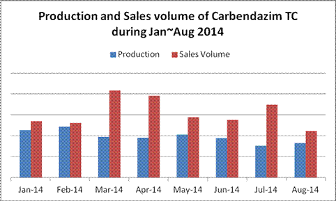 With the same number of manufacturers operating in Aug (compared with that of Jul), output of carbendazim TC increased by 8.5% MoM, while sales volume decreased significantly by 35.8% than that of Jul, which also resulted from the poor season of exports.