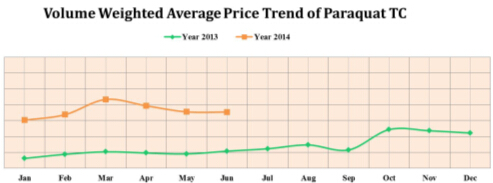 According to CCPIA monthly bulletin of statistics of China pesticides, in June, VWAP of paraquat TK kept the same level with that of May. Seen from output, there were 9 manufacturers operating in June, same with that of May, and output of paraquat TK declined slightly by 2% MoM. Sales volume played the same trend. It’s not like common guesses in the market that paraquat production would be in mad increasing before the deadline of paraquat AS production.