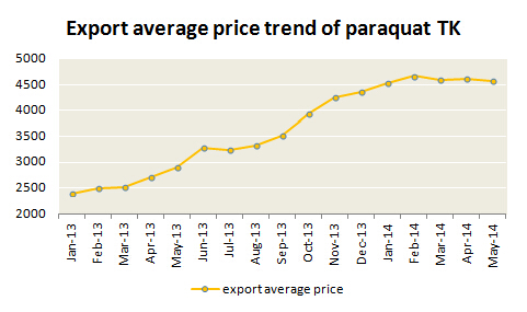 Seen from export situation, average price of paraquat TK began to fell since Feb, till May, the average price declined to $4600 per tonne. Meanwhile export bills and volume both kept smooth.