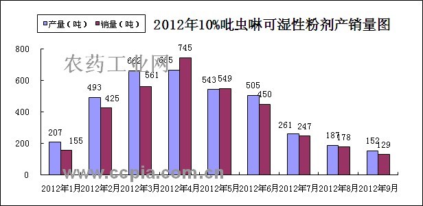 以下為10%吡蟲啉可濕性粉劑2012年1-9月產(chǎn)量和銷量趨勢圖: