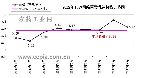據農藥工業網數據統計,1.8%阿維菌素乳油2012年9月價格為3.65萬元/噸,較8月環比下降5.2%,較去年同期同比上漲10.6%。從今年的價格走勢來看,價格最高點為今年8月,價格為3.85萬元/噸,最低點為今年2月,價格為3.26萬元/噸。