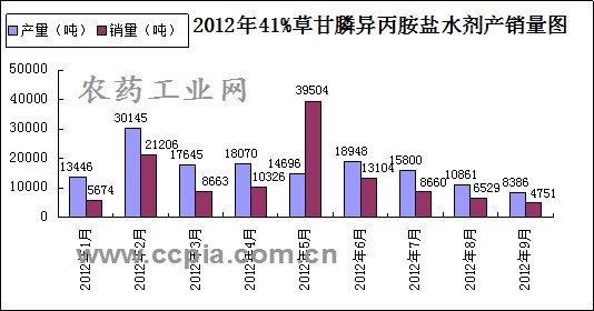 以下為41%草甘膦異丙胺鹽水劑2012年1-9月產量和銷量趨勢圖: