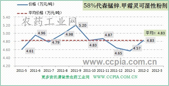 58%代森錳鋅.甲霜靈可濕性粉劑2月份均價(jià)4.83萬(wàn)元/噸,有所上揚(yáng)。據(jù)中國(guó)農(nóng)藥工業(yè)網(wǎng)數(shù)據(jù)統(tǒng)計(jì),該產(chǎn)品2月份國(guó)內(nèi)銷(xiāo)量為171噸,本月產(chǎn)量約為193噸,產(chǎn)銷(xiāo)兩旺。具體走勢(shì)如圖: