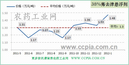 38%莠去津懸浮劑開春價格有所上升,1月份均價在1.48萬元/噸,而近半年的平均價格為1.3萬元/噸,走勢圖如圖。