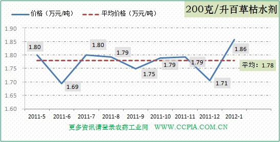 200克/升百草枯水劑近半年來(lái)價(jià)格比較平穩(wěn),均價(jià)在1.78萬(wàn)元/噸。1月份價(jià)格上漲至1.86萬(wàn)元/噸,隨著節(jié)后企業(yè)逐步開(kāi)工,預(yù)計(jì)后期會(huì)回落到均價(jià)水平。