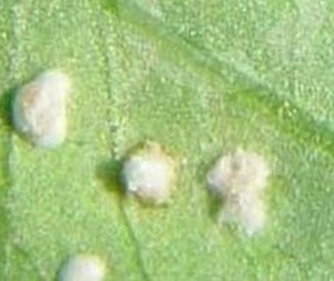 癥狀:主要為害葉片,初在葉背面產生白色皰狀小膿皰,大小1~5毫米,對應葉面呈淺黃色至灰白色,邊緣不明顯,后期病斑表皮破裂,散出白色粉狀物,即病菌的孢子,病斑多的葉片黃枯。