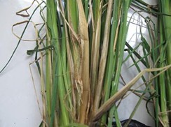 發(fā)病癥狀:水稻惡苗病又稱(chēng)徒長(zhǎng)病,全國(guó)各稻區(qū)均有發(fā)生。病谷粒播后常不發(fā)芽或不能出土。苗期發(fā)病病苗比健苗細(xì)高,葉片葉鞘細(xì)長(zhǎng),葉色淡黃,根系發(fā)育不良,部分病苗在移栽前死亡。在枯死苗上有淡紅或白色霉粉狀物,即病原菌的分生孢子。發(fā)病后節(jié)間明顯伸長(zhǎng),節(jié)部常有彎曲露于葉鞘外,下部莖節(jié)逆生多數(shù)不定須根,分蘗少或不分蘗。剝開(kāi)葉鞘,莖稈上有暗褐條斑,剖開(kāi)病莖可見(jiàn)白色蛛絲狀菌絲,以后植株逐漸枯死。濕度大時(shí),枯死病株表面長(zhǎng)滿(mǎn)淡褐色或白色粉霉?fàn)钗铮笃谏谏↑c(diǎn)即病菌囊殼。病輕的提早抽穗,穗形小而不實(shí)。抽穗期谷粒也可受害,嚴(yán)重的變褐,不能結(jié)實(shí),穎殼夾縫處生淡紅色霉,病輕不表現(xiàn)癥狀,但內(nèi)部已有菌絲潛伏。