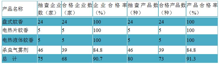 按照國家質(zhì)檢總局的統(tǒng)一部署,國家家用殺蟲用品質(zhì)檢中心牽頭,江蘇省質(zhì)檢院參與對山東、河北、廣東、福建、浙江、湖南、江西、廣西、四川、江蘇、安徽等11個(gè)省75家企業(yè)生產(chǎn)的80種產(chǎn)品進(jìn)行了監(jiān)督抽查,經(jīng)檢驗(yàn),產(chǎn)品實(shí)物質(zhì)量抽樣合格率為91。3%。